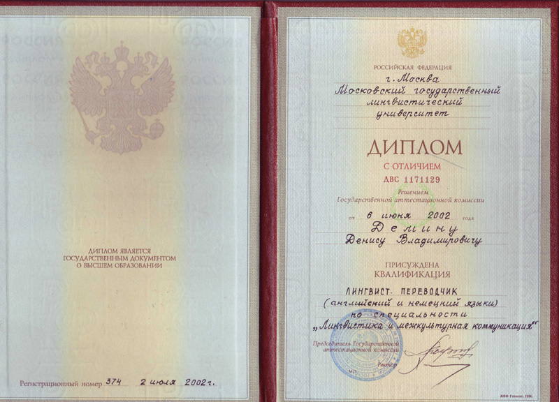 - Переводческий факультет МГЛУ (бывший МГПИИЯ им. М. Тореза), диплом с отличием