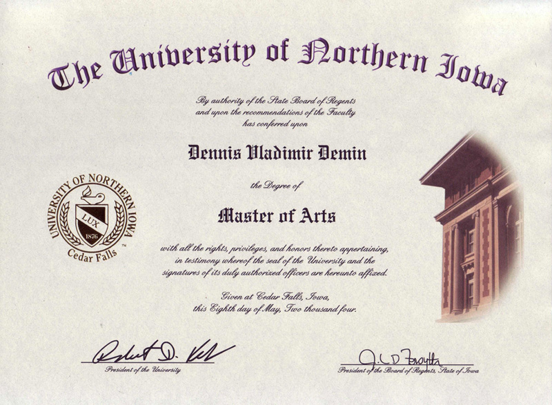- Университет Северной Айовы (University of Northern Iowa), магистр искусств (MA)